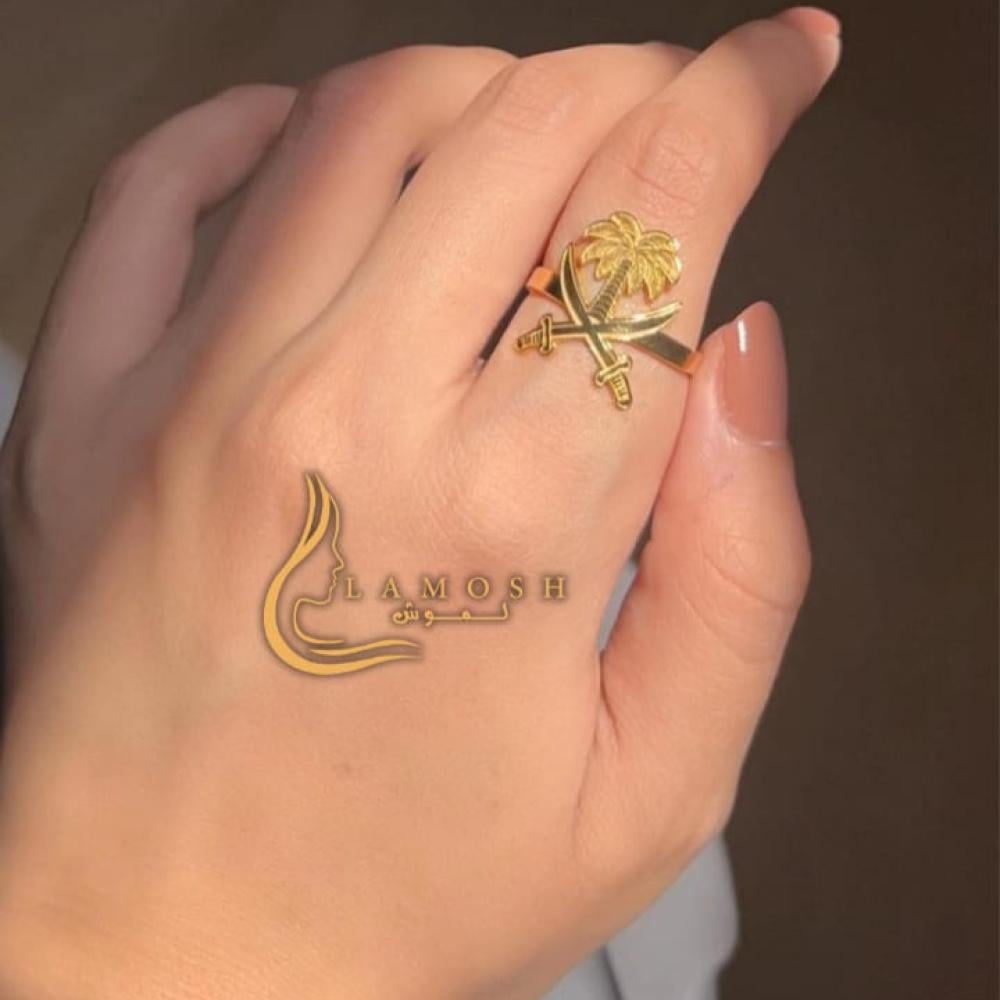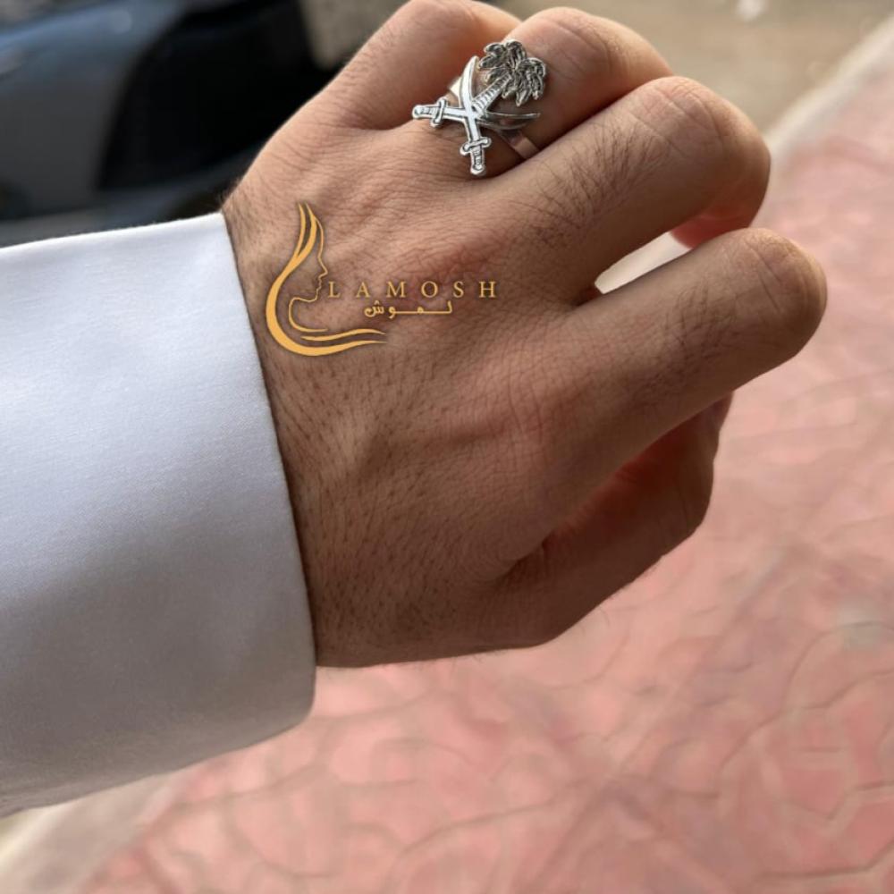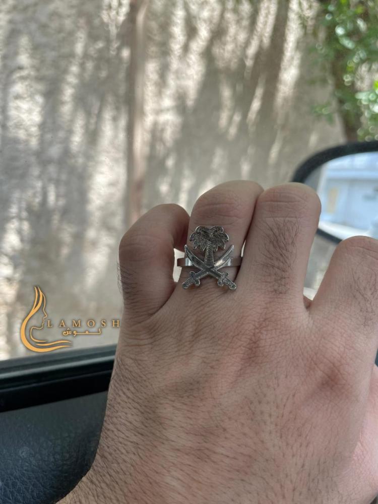 المزيج بين الأناقة والدقة مع خاتم الفضة صنع باتقان ليناسب عراقة اختيارك وفرادة ذوقك. تعتبر هذه القطعة من المجوهرات مثالية للمناسبات الخاصة أو للاستخدام اليومي، حيث يعكس تصميم السيفين والنخله شعار وهويه قايدنا اطال الله في عمره وحفظه بالاضافة الى أنها تعكس القوة والشجاعة. هذا الخاتم مثالي لاضافة لمسة من الرقي الى مظهرك، ومن المؤكد أنها ستصبح ملحقك المفضل!
